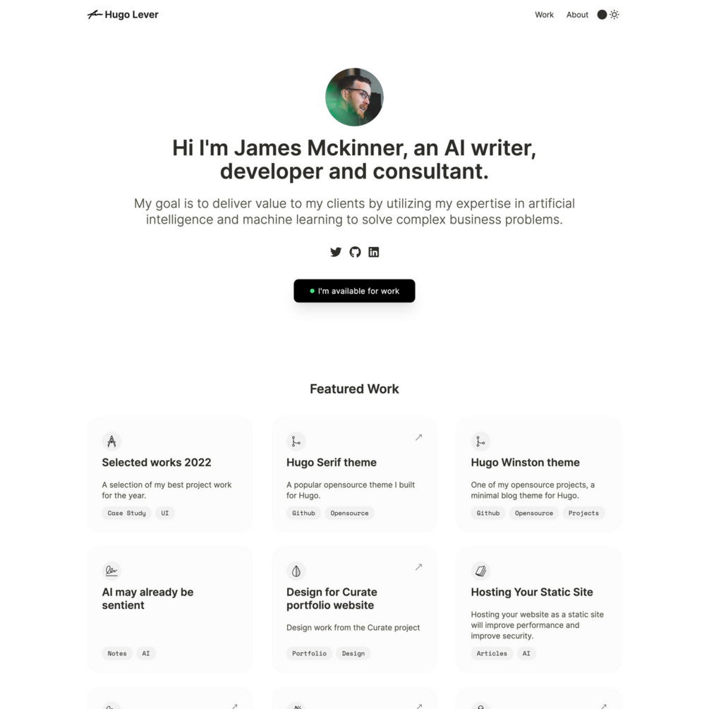 Hugo Lever is a sleek bio/portfolio/freelancer theme. Looks great with minimal content so you can ramp up fast.